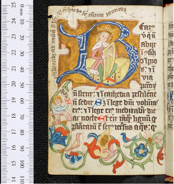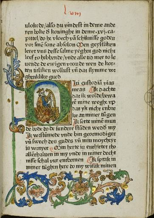Figure 5: Weimar, Herzogin Anna Amalia Bibliothek, Fol. 35, 7v. A rare fifteenth-century interlinear translation of the psalter from Latin into Middle Low German; the initial shows King David playing the harp. Although its visual language is closely related to Lucas Brandis’s vernacular printed psalter, the translation itself is independent and not identical to the print. © HAAB Weimar.