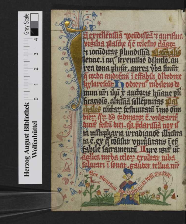 Figure 2: Hildesheim, Dombibliothek, J 29, fol. 1v. Opening page of the Easter prayer book completed in 1478 by the Medingen nun Winheid von Winsen. The prayer book is carefully decorated throughout in the distinctive, well-recognisable Medingen house style. © Dombibliothek Hildesheim.